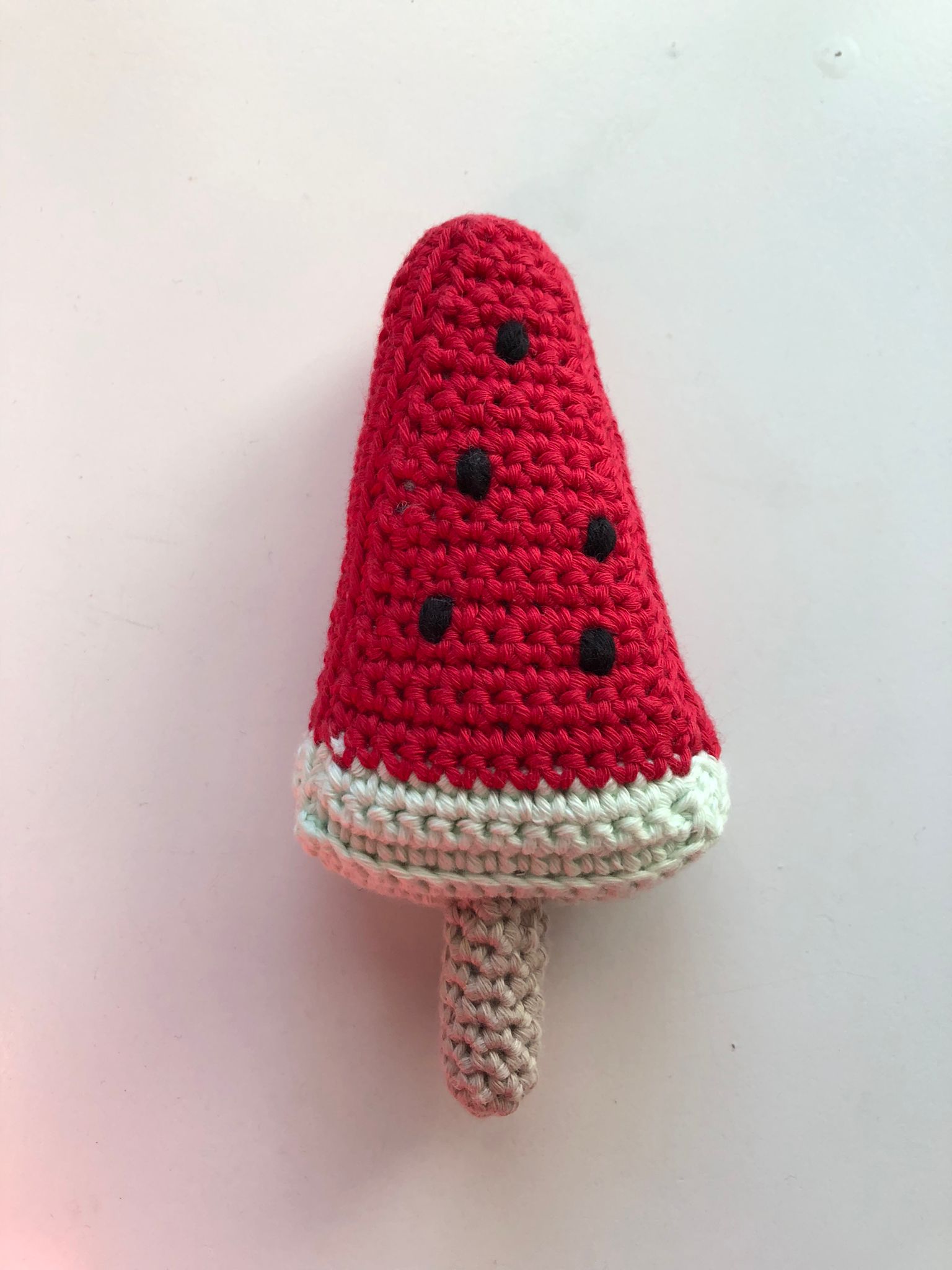 Dieses Melonen-Eis ist ein echter Sommerliebling! Mit seinem roten Körper, den kleinen Punkten und dem Holzstiel sieht es aus wie ein Stück Wassermelone am Stiel – nur ohne zu schmelzen. Ideal für kleine Eisverkäuferinnen und -verkäufer oder als fröhliche Ergänzung in der Kinderküche.